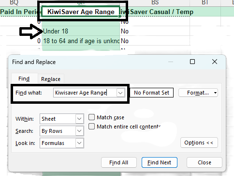 3. Open this report in Excel and Ctrl F to to find the Kiwisaver Age Range column, delete all rows that don't include Under 18.
