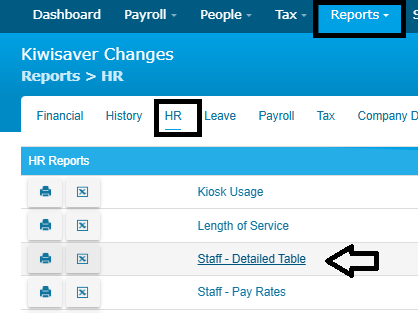 1. Go to Reports > HR > Click on the Staff – Detailed Table report.