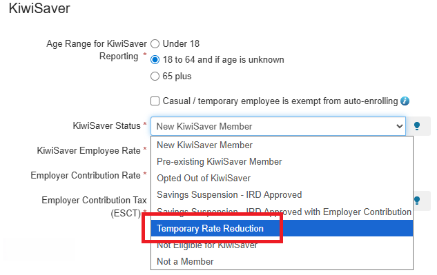 - From the KiwiSaver Status dropdown, select Temporary Rate Reduction.